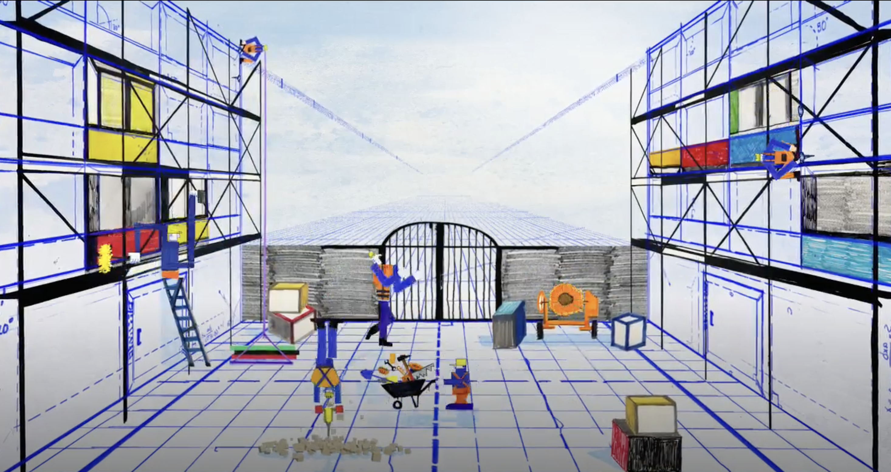 반대로 건설 노동자 이스트반의 건설 현장은 직각과 평면, 청사진 같은 기하학적 공간으로 그려집니다. 사람과 건물, 크레인이 하나의 설계도 안으로 편입된 것 같은 이 세계는, 개의 감각에서 포착된 규칙성과 긴장, 구조의 압박감을 추상화한 그림처럼 보입니다.